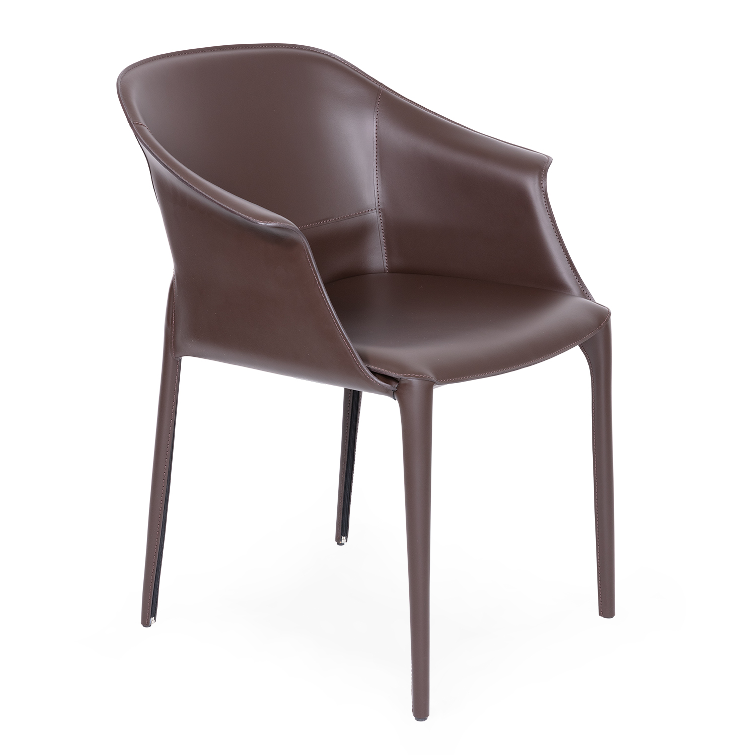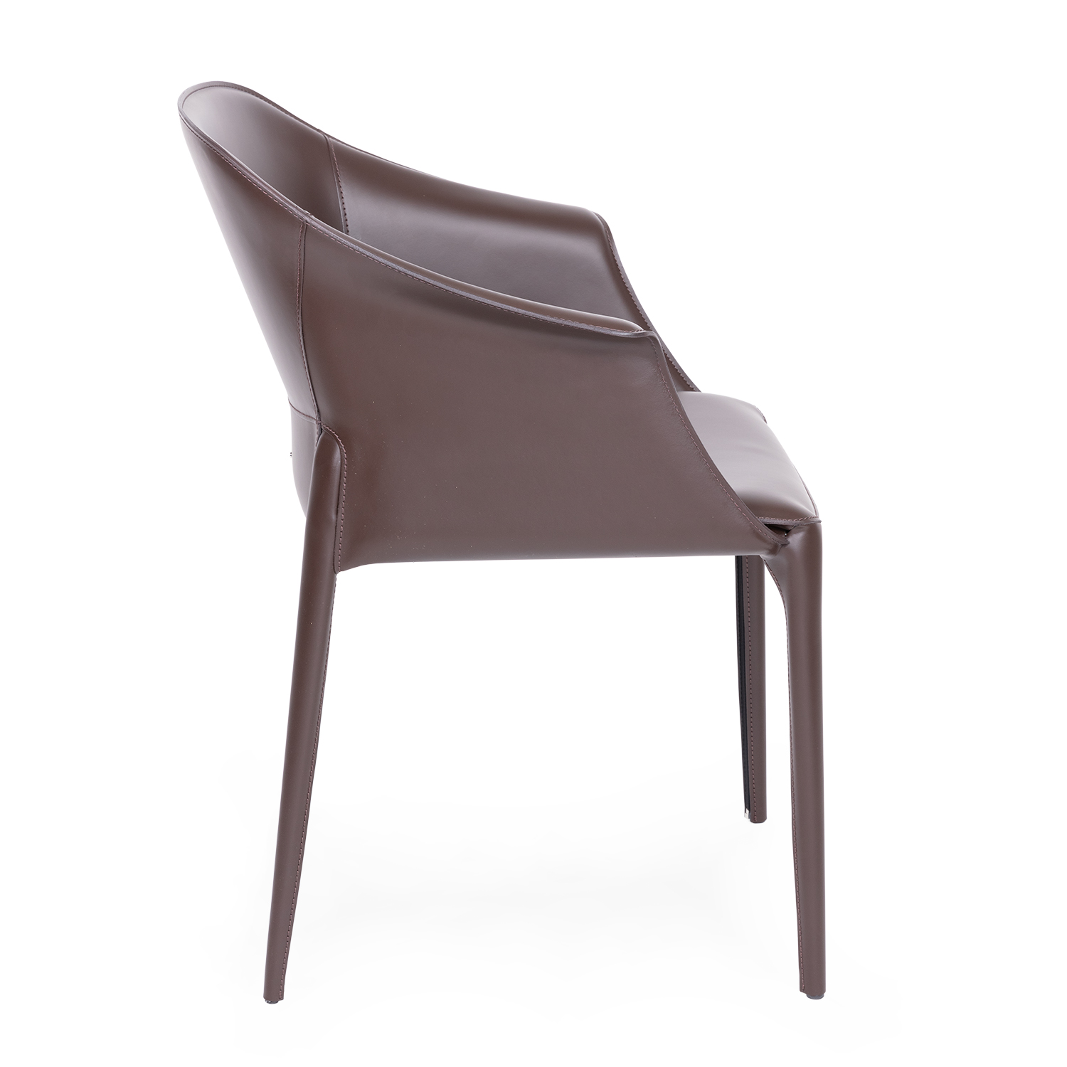 [0] => The Zuleika Chair, designed by Cattelan Italia, is elegant and sophisticated. Zuleika features upholstery in dark brown leather with matching stitching for a monochromatic look. The flared armrests provide a welcoming, comfortable feel, and the thin, slightly tapered legs are also upholstered in the same dark brown leather for a cohesive, luxurious design.