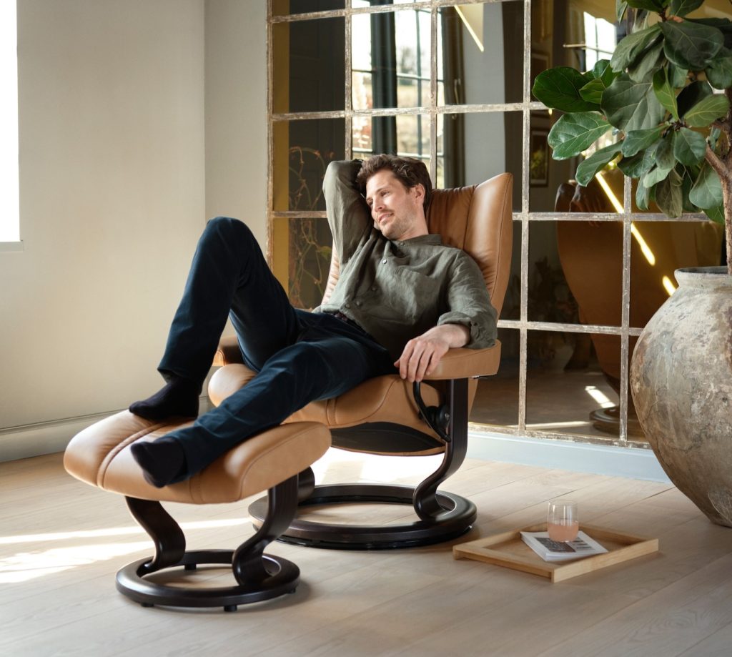 The Wing Chair and Ottoman by Stressless® of Norway is one of the first and most popular Stressless® designs, dating back to 1994. Engineered for superior comfort, Wing combines a timeless look with cutting-edge ergonomic technology. This chair’s inner workings feature the patented Plus™ and Glide systems, which provide continuous support for the head and lower back while also adjusting the reclining angle based on shifts of the body. True to its name, Wing has a smoothly curved “winged” headrest, as well as matching stitching that creates crisp lines in the leather. This chair’s wide profile and comfortable feel truly allow you to sit back and stress less.